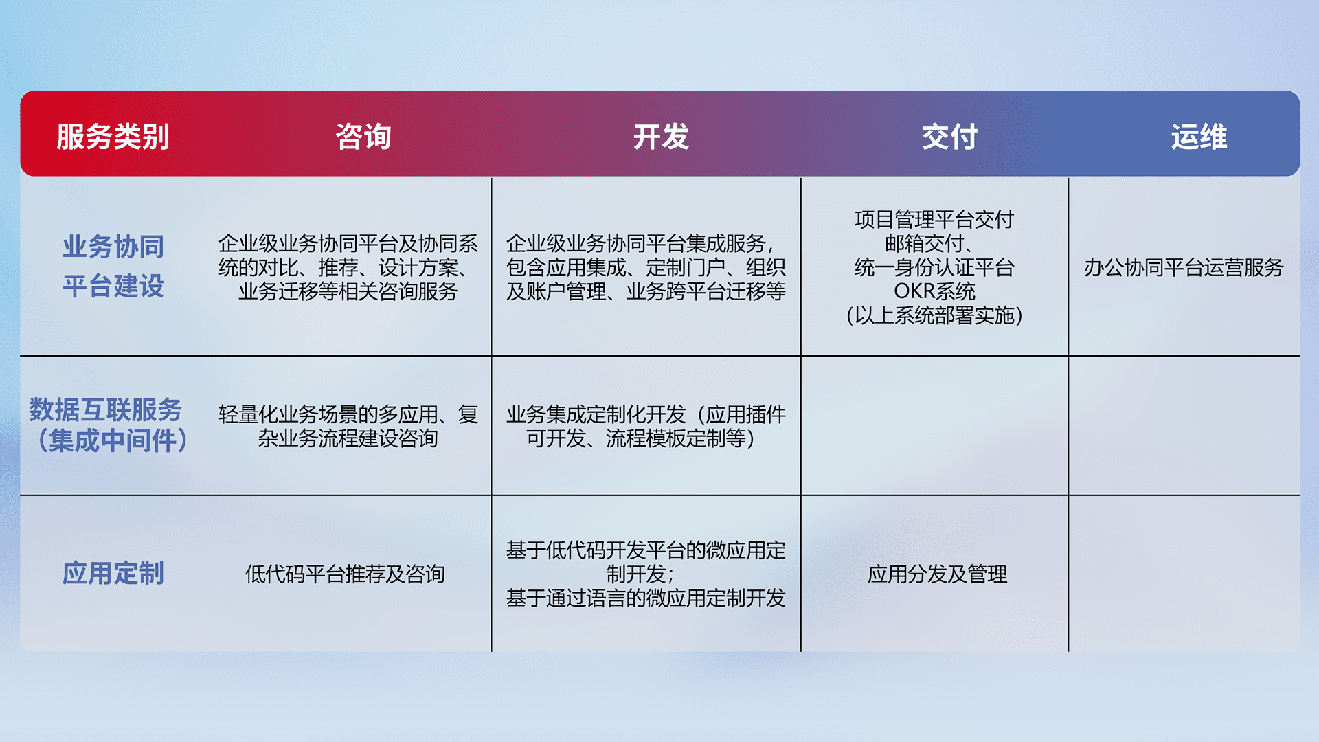 针对钉钉、、、、企微、、IDaas等平台级产品提供产品的规划、、方案、、、交付、、、、定制化开发等服务,,,实现如统一协同办公、、、智能客户服务、、、、混合会议管理、、、智能数据查询、、等业务场景,,实现数字化转型。。。。